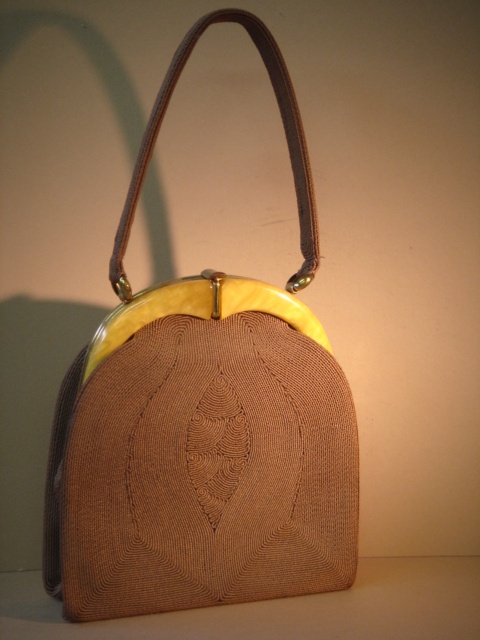 PALE COFFEE COLOUR CORD HANDBAG WITH AMBER BAKELITE TOP 19 CM
