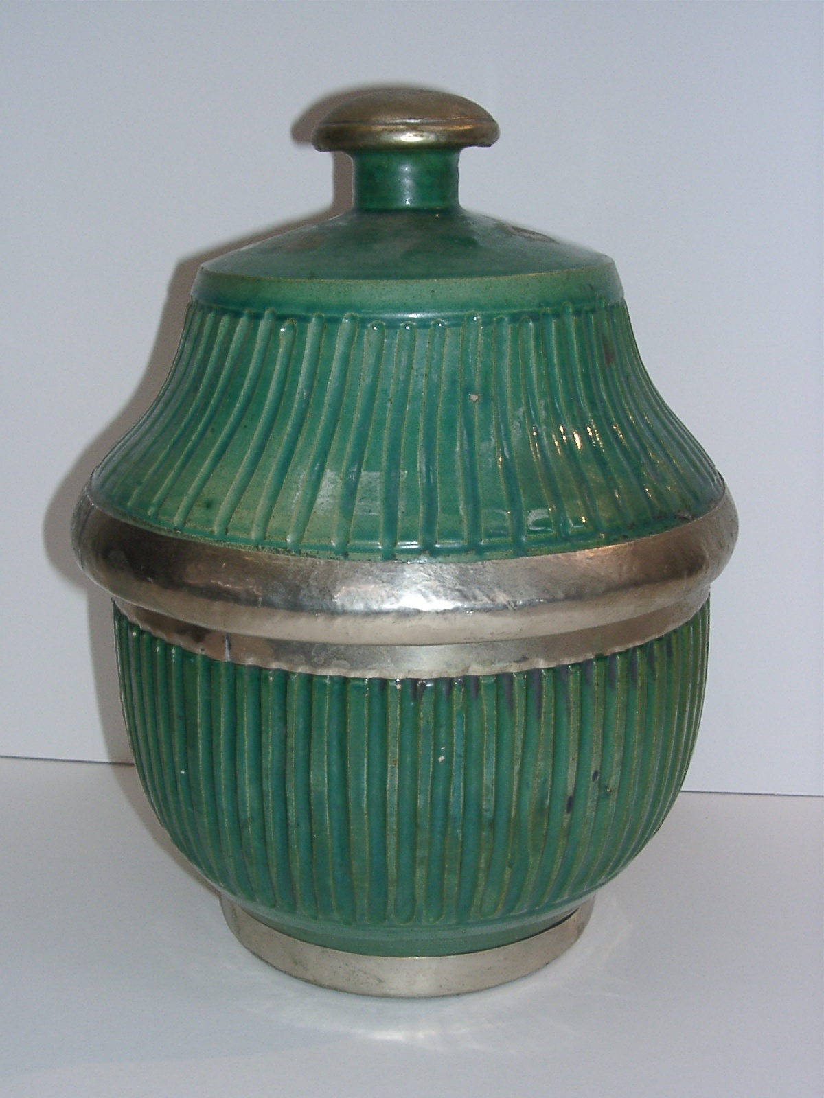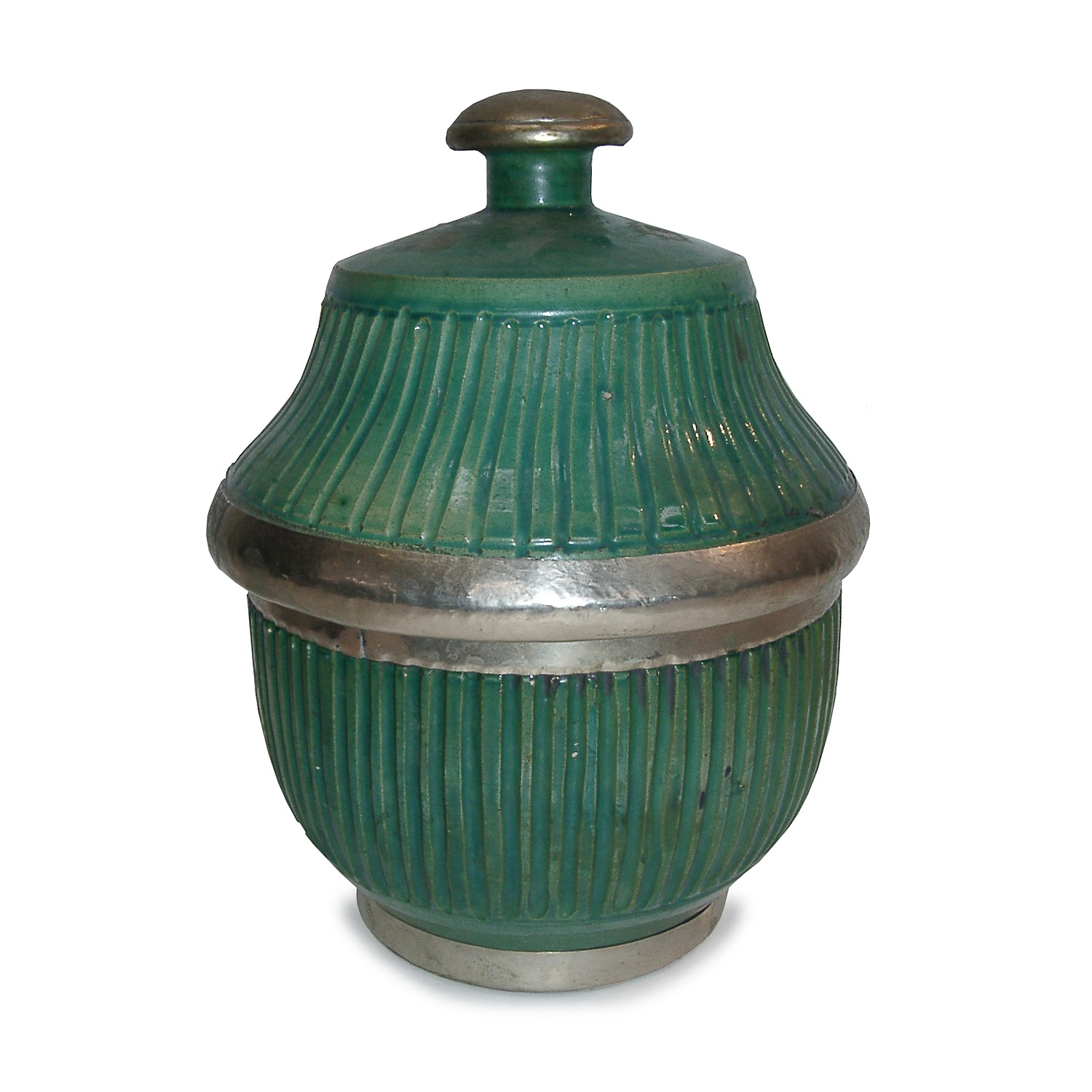 PALE GREEN MOROCCAN CHEMLA VASE 12" HIGH PLAIN COLOUR WITH RIBBED SIDE SILVER MOUNTED DEEP LID