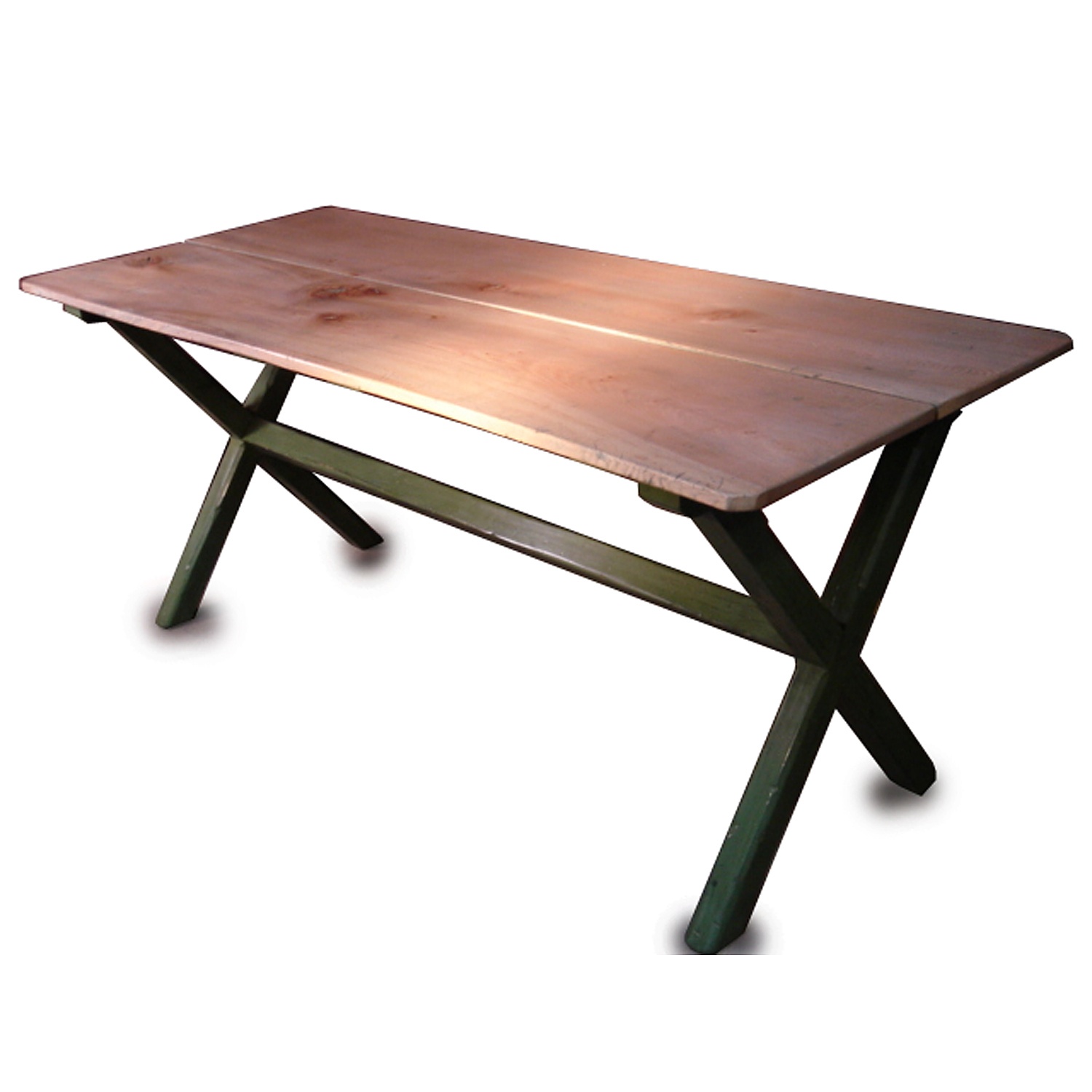 PALE GREEN PAINTED X LEG KITCHEN TABLE WITH A BLEACHED ELM TOP 183 CM LONG 76 CM WIDE 76 CM HIGH