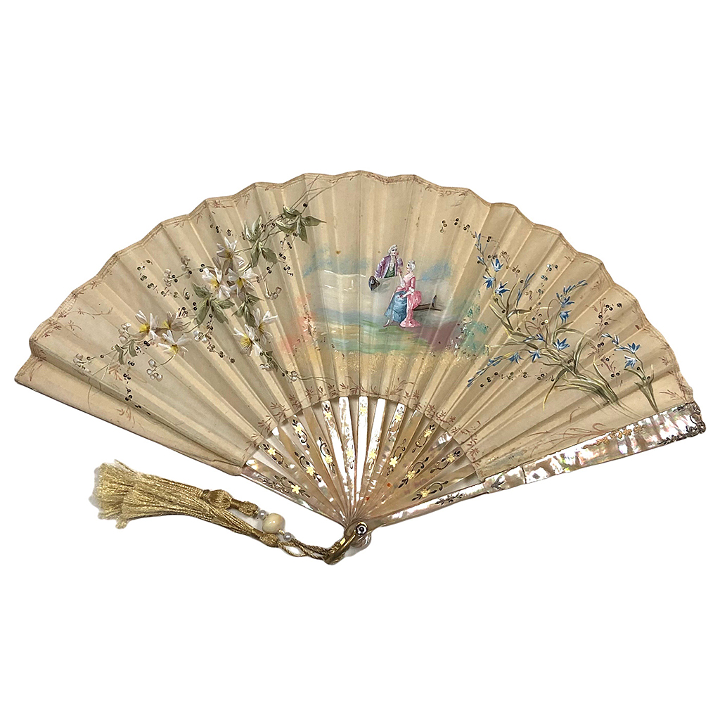 PAPER FAN WITH PAINTED PICTURAL SCENE WITH FLOWERS AND FIGURES WITH DECORATIVE MOTHER OF PEARL STICKS