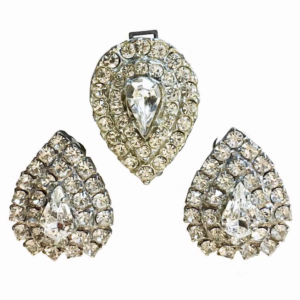 PEAR SHAPED CLEAR PASTE BROOCH WITH MATCHING EARRINGS