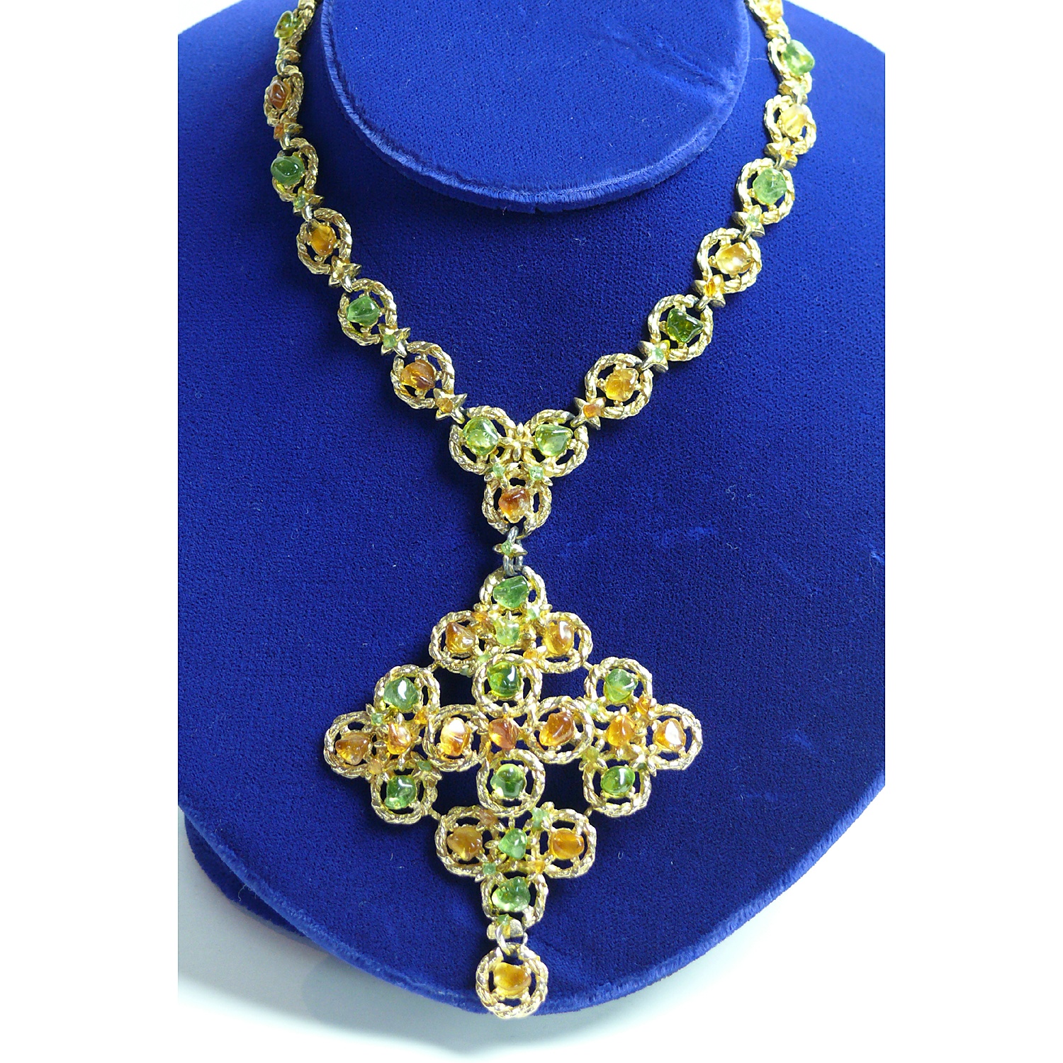 PERIDOT AND CITRINE JEWEL ENCRUSTED CRUCIFIX / CROSS NECKLACE BY SWOBODA 1970'S