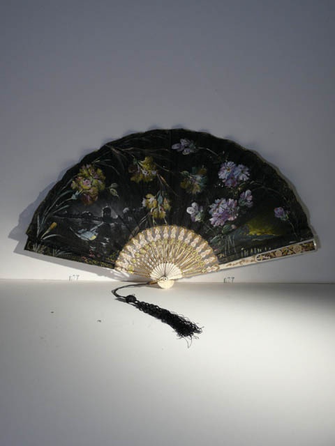 PERIOD FAN CARVED BONE AND BLACK SILK WITH FLORAL DECORATION ITALIAN 19TH CENT 25 CM HIGH