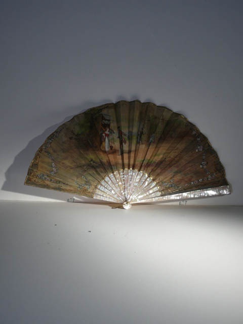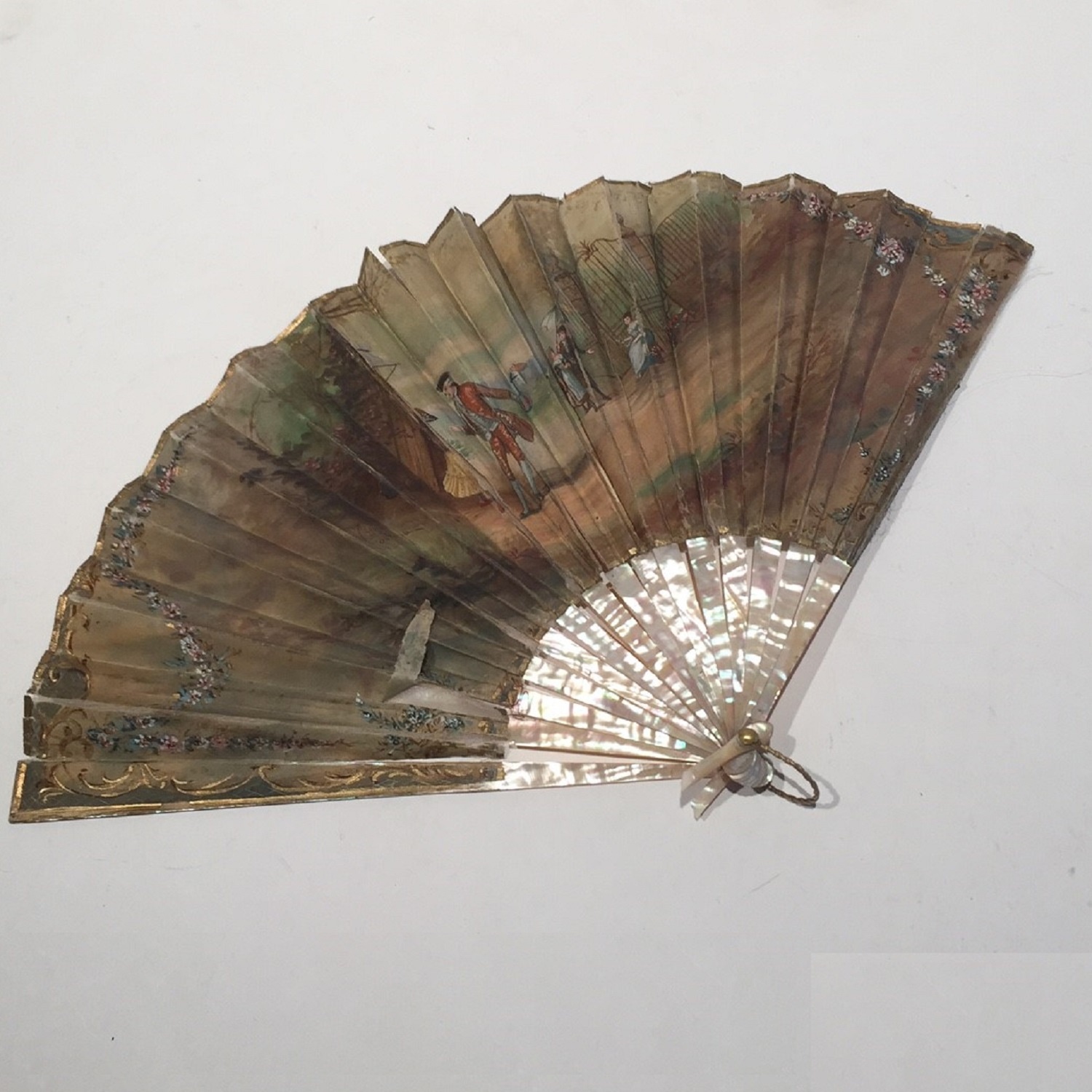 PERIOD FAN MOTHER OF PEARL AND HAND PAINTED SILK ITALIAN 19TH CENT. 23 CM HIGH (DAMAGED)