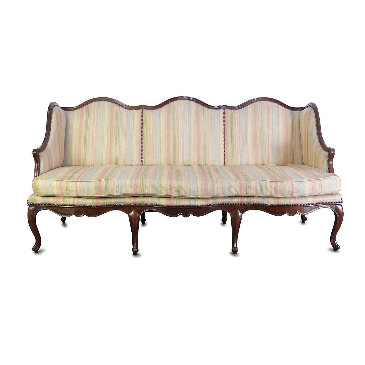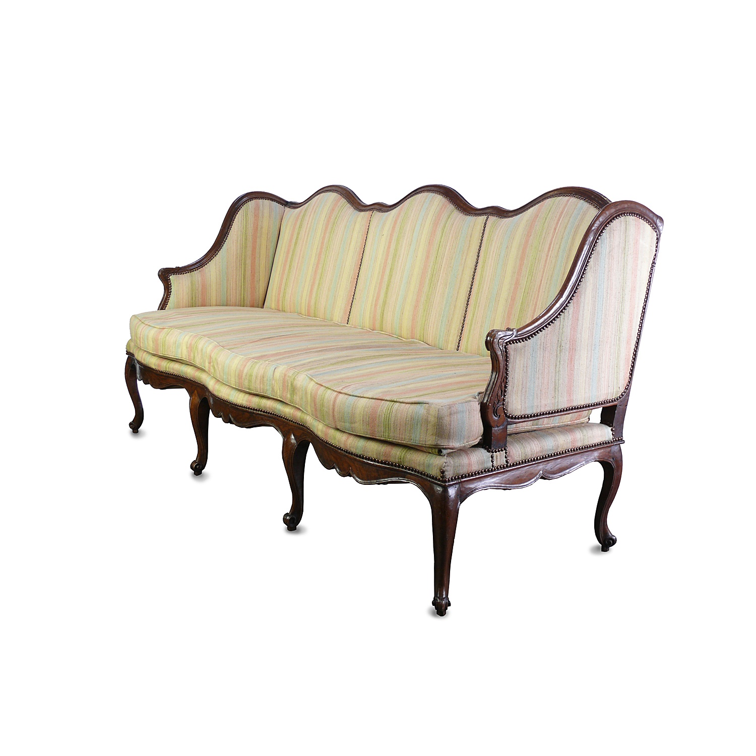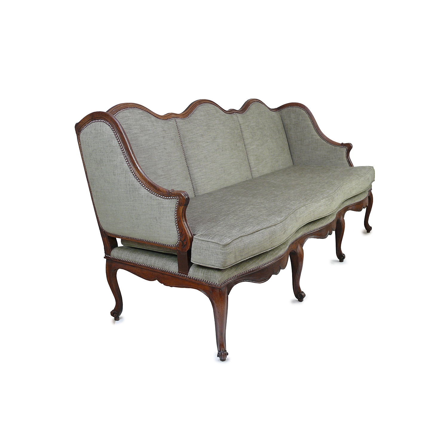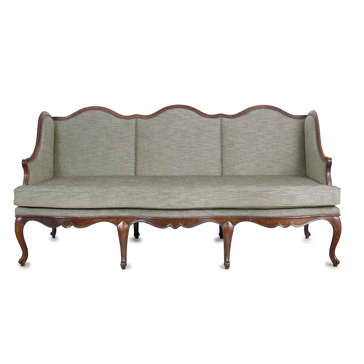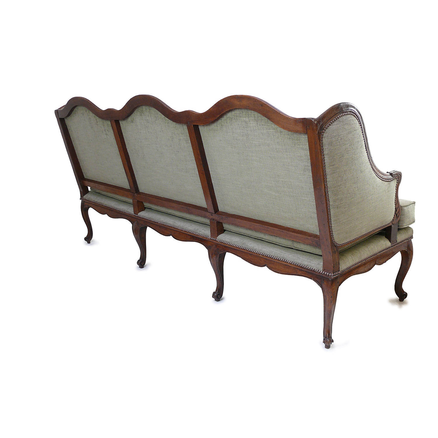 PERIOD FRENCH LOUIS XV SETTEE / SOFA WALNUT WITH A TRIPLE ARCH BACK THREE SEATER SAGE GREEN UPHOLSTERY CIRCA 1750 101 CM HIG 201 CM LONG 87 CM DEEP