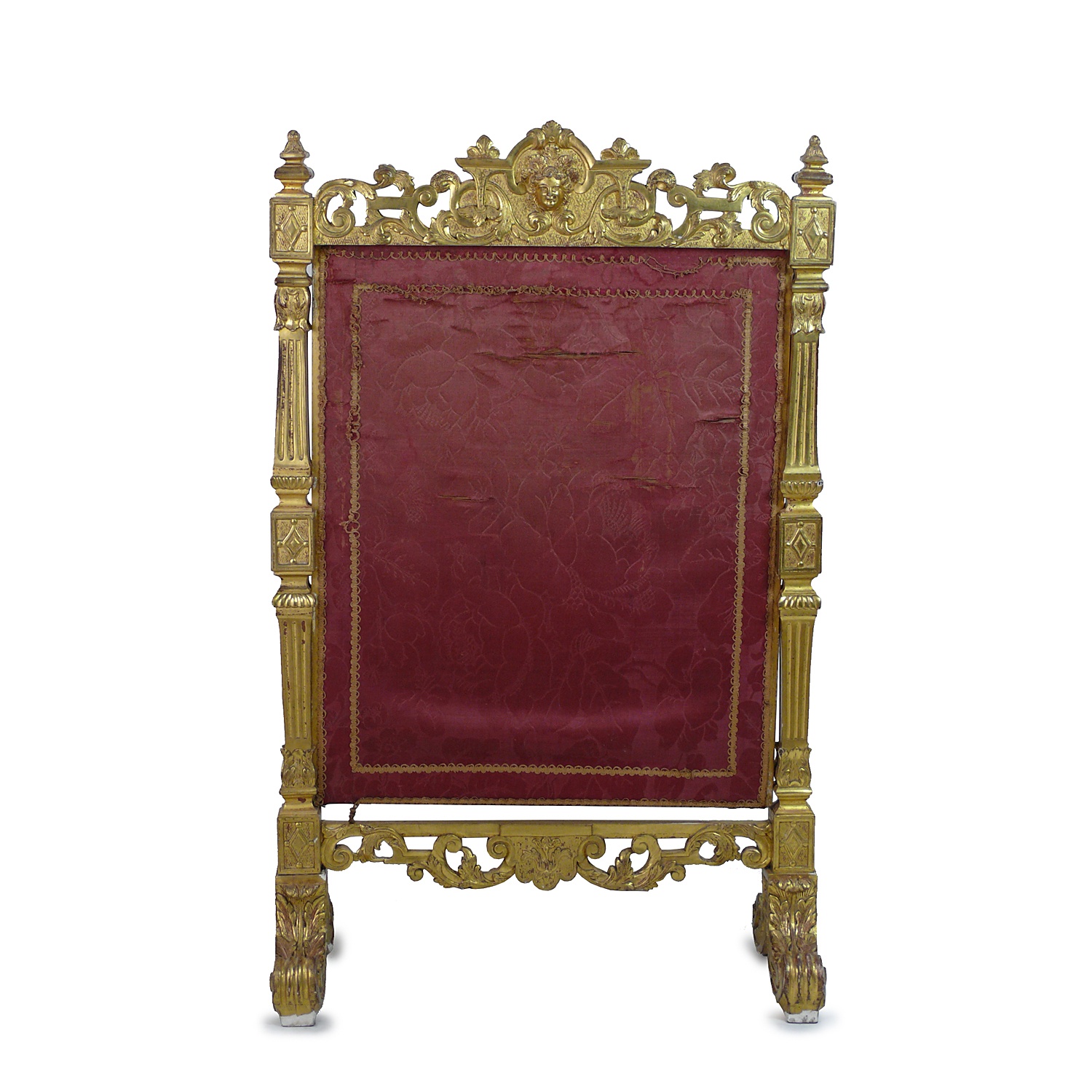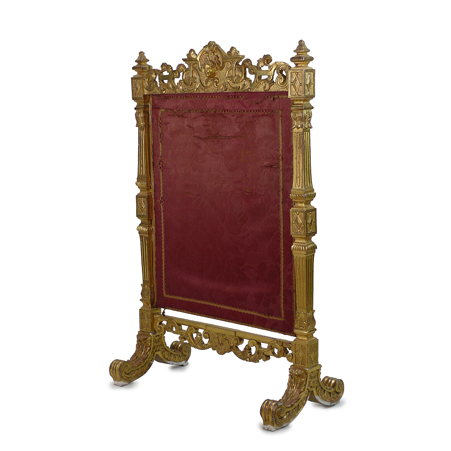 PERIOD FRENCH REGENCE FIRE SCREEN FINE ORNATE CARVED AND GILDED WITH PINK DAMASK PANEL CIRCA 1720 125 CM HIGH 76 CM WIDE
