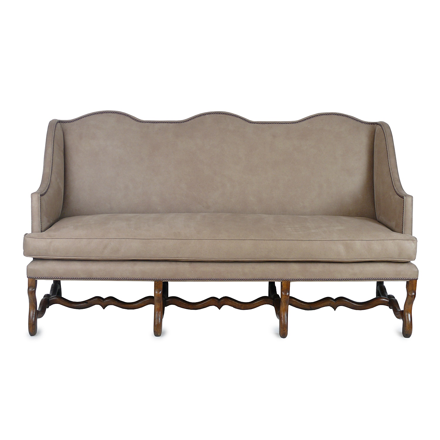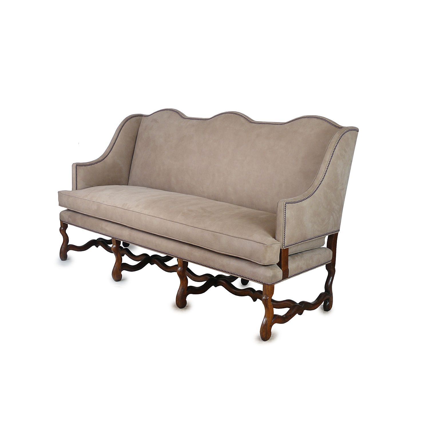 PERIOD FRENCH SETTEE / SOFA LOUIS XIII WITH TRIPLE ARCH BACK THREE SEATER UPHOLSTERED IN BEIGE FAUX SUEDE WITH BRASS NAILS 107 CM HIGH 190 CM LONG 64 CM DEEP