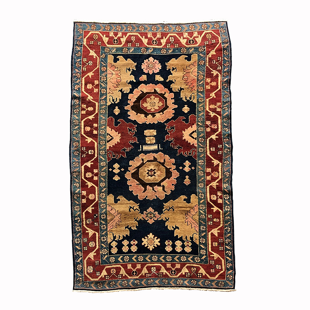 PERSIAN HEREZ RUG / CARPET TWO TONE BLUE AND RED TWO MEDALLIONS WITH FLORAL BORDER 221 CM LONG 112 CM WIDE