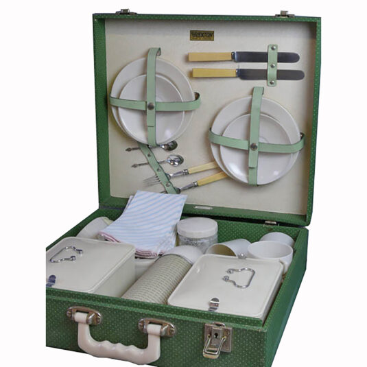 PICNIC HAMPER BREXTON GREEN POKER DOT CASE COMPLETE FITTED WITH 31 PIECES