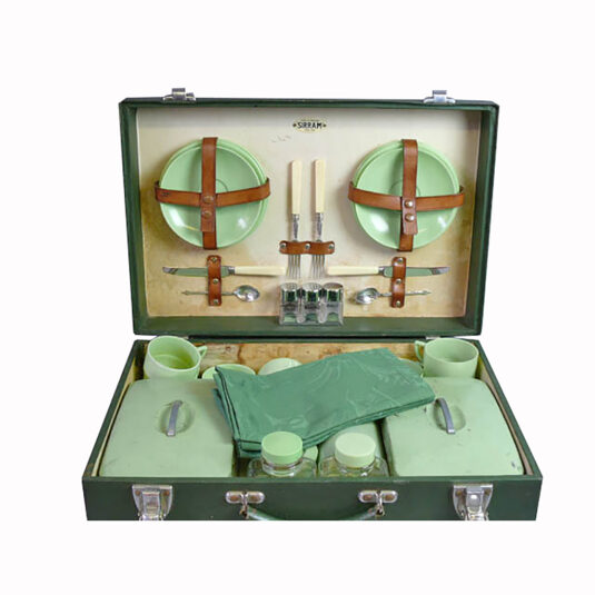 PICNIC HAMPER COMPLETE FITTED SIRRAM CASE WITH 34 PIECES GREEN
