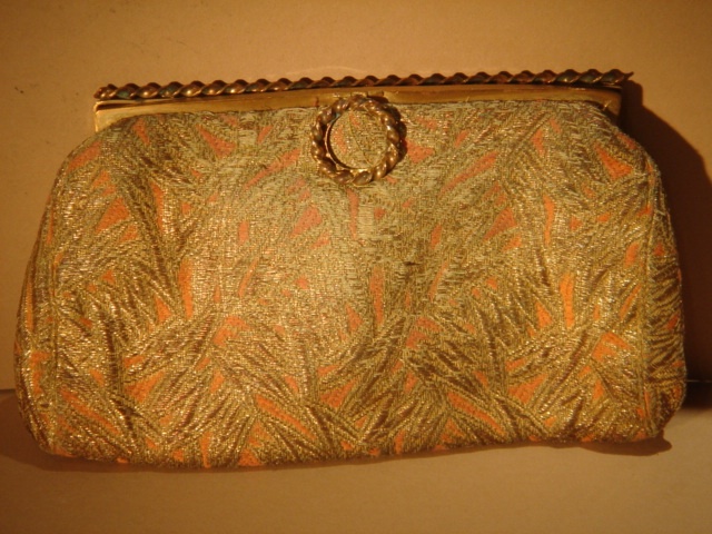 PINK AND GOLD FABRIC CLUTCH HANDBAG WITH RING CLASP 20 CM WIDE