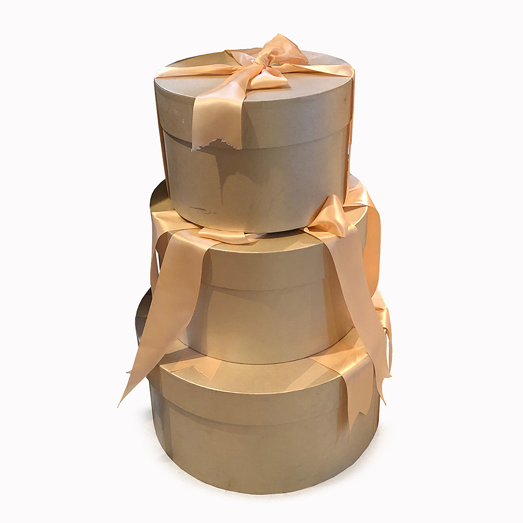PLAIN BEIGE CARD HAT BOX WITH SLIGHT SHEEN AND PEACH SILKEN RIBBON CARRIER (3 SIZES)