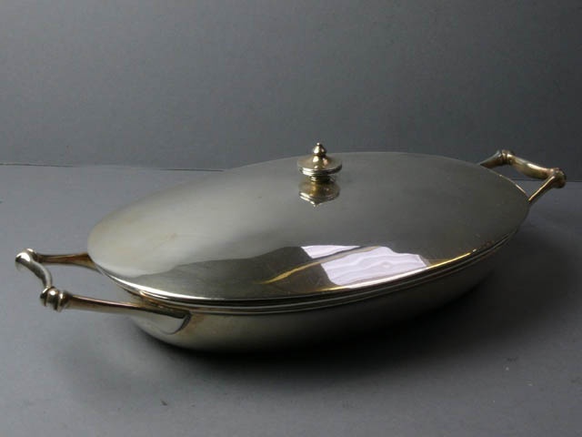 PLAIN E.P. SILVER FISH DISH WITH LID AND TWIN HANDLES 30 CM