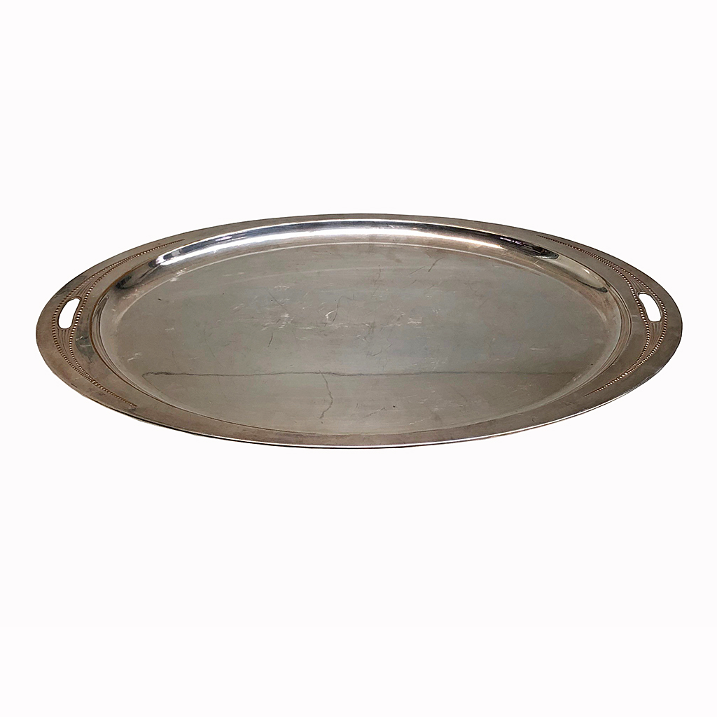 PLAIN OVAL E.P. SILVER TEA TRAY WITH SLIGHT BEAD DECORATED HANDLES 50 CM LONG