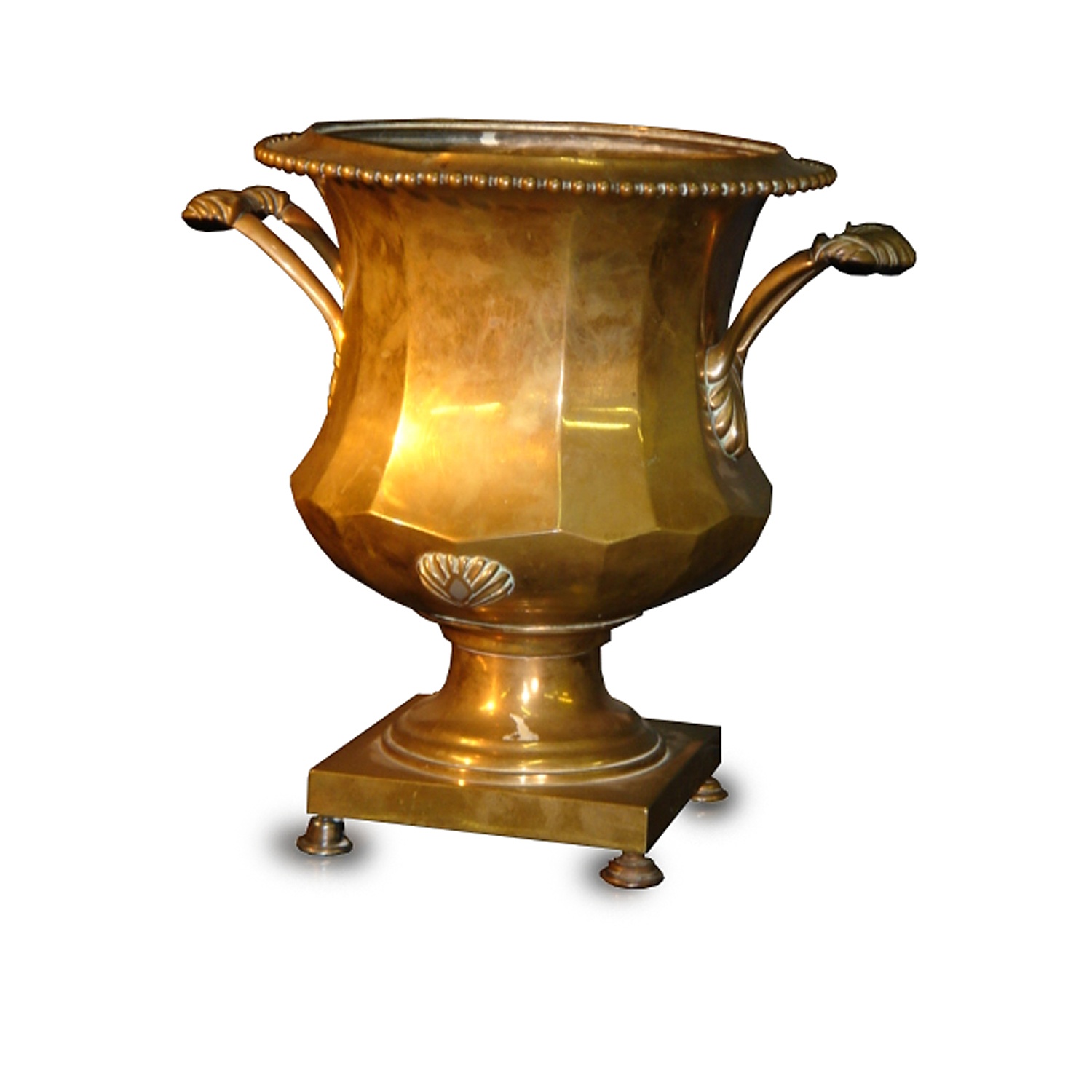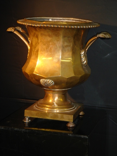 POLISHED BRASS GOBLET SHAPE / WINE COOLER VASE WITH WHITE CHINA LINER 36 CM WIDE 34 CM HIGH OPENING 20 CM DIAMETER