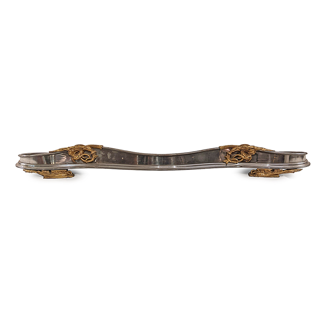 POLISHED STEEL AND BRASS FIRE FENDER SERPENTINE FRONT WITH LEAF END DECORATION CIRCA 1860 148 CM WIDE 44 CM DEEP