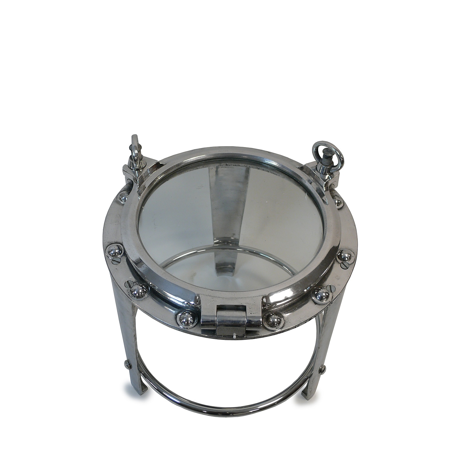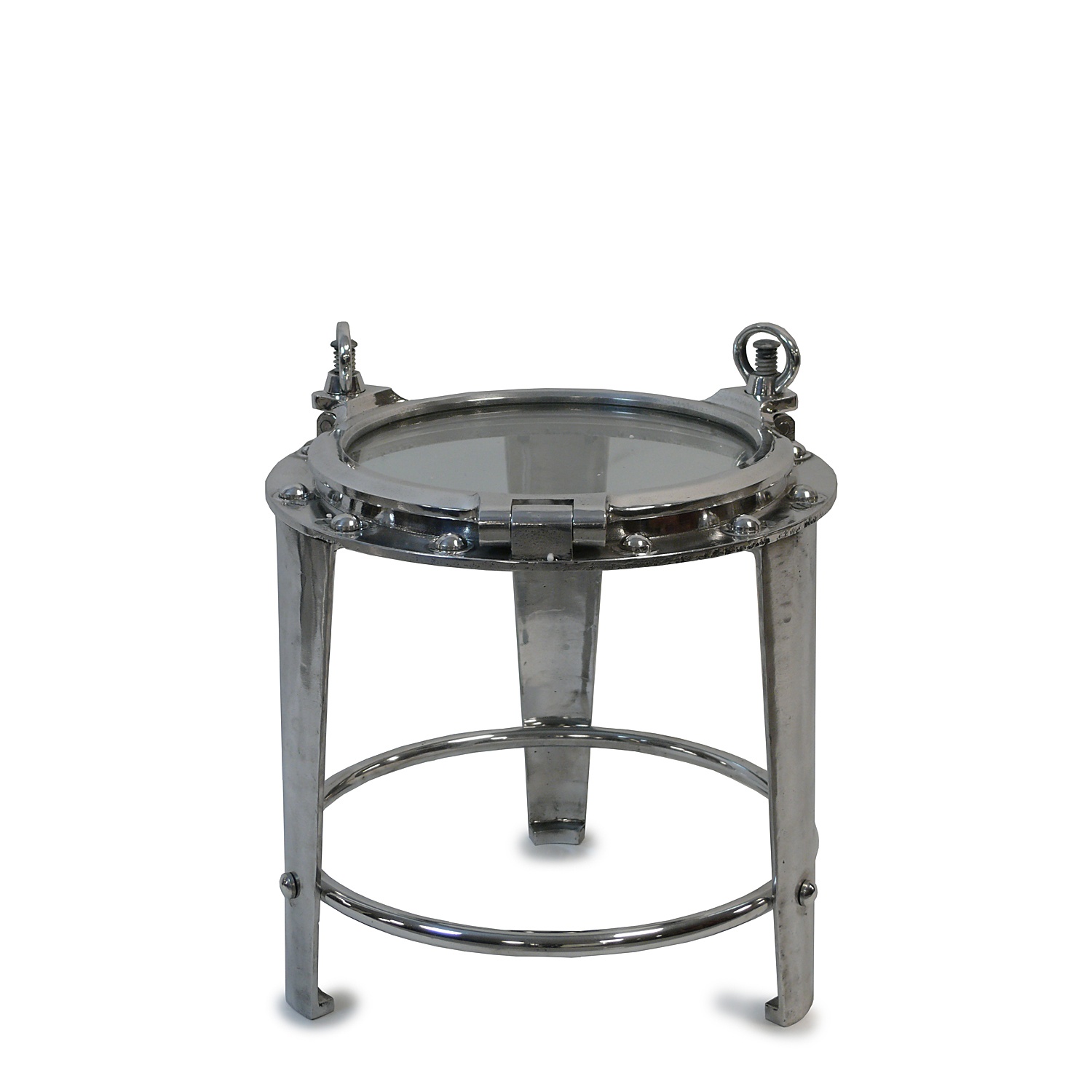 PORTHOLE OCCASIONAL TABLE POLISHED ALLUMINIUM WITH A GLASS TOP 50 CM HIGH 50 CM DIAM (X2)