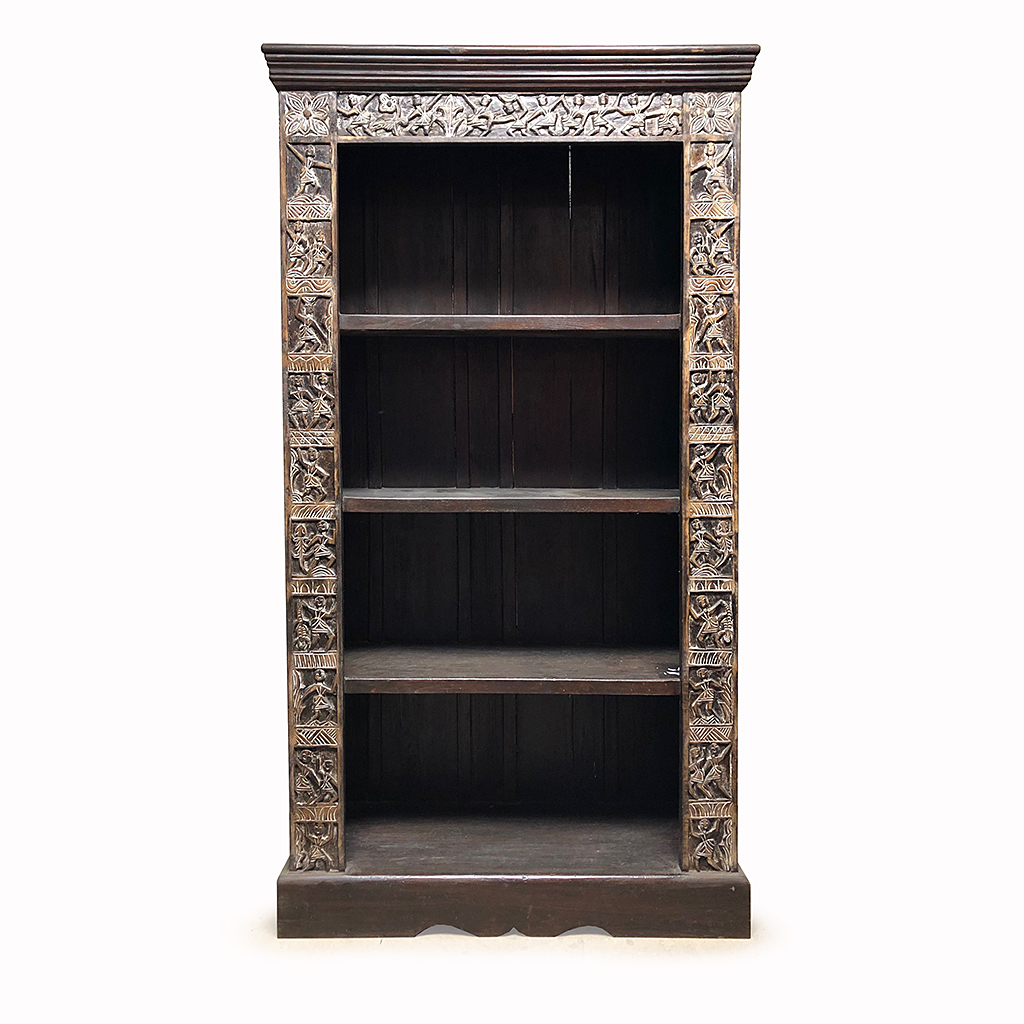 PRIMITIVE CARVED DARK WOOD INDIAN SHELVES / BOOKCASE 183 CM HIGH 97 CM WIDE 34 CM DEEP (X2)