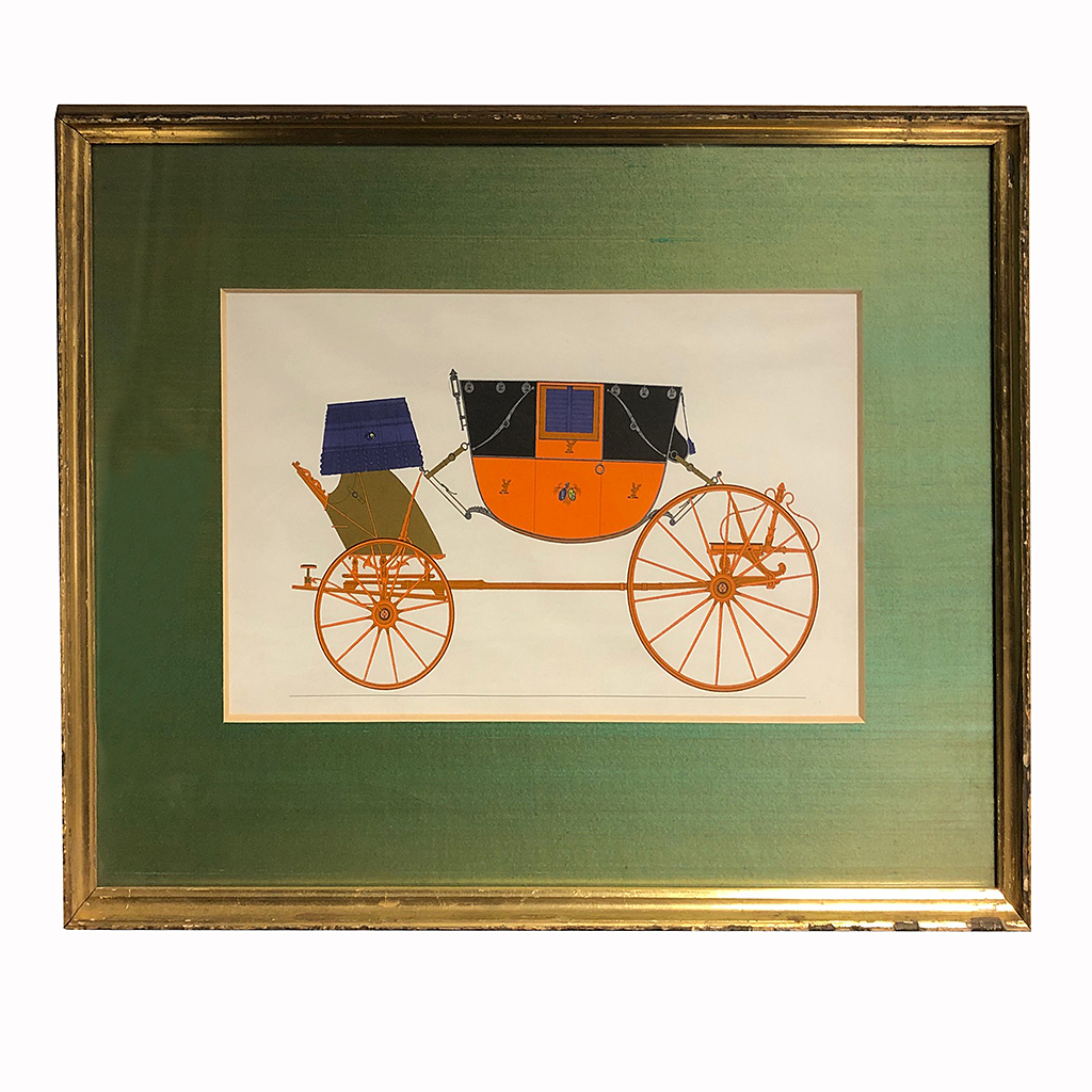 PRINT OF A HORSE DRAWN CARRIAGE IN GILT FRAME AND GREEN MOUNT