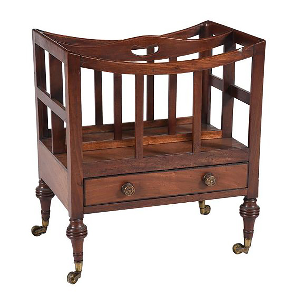 REGENCY CANTERBURY MAGAZINE RACK MAHOGANY AND EBONY STRUNG WITH SWEPT TOP AND LATTICE SIDES CIRCA 1815 51 CM HIGH