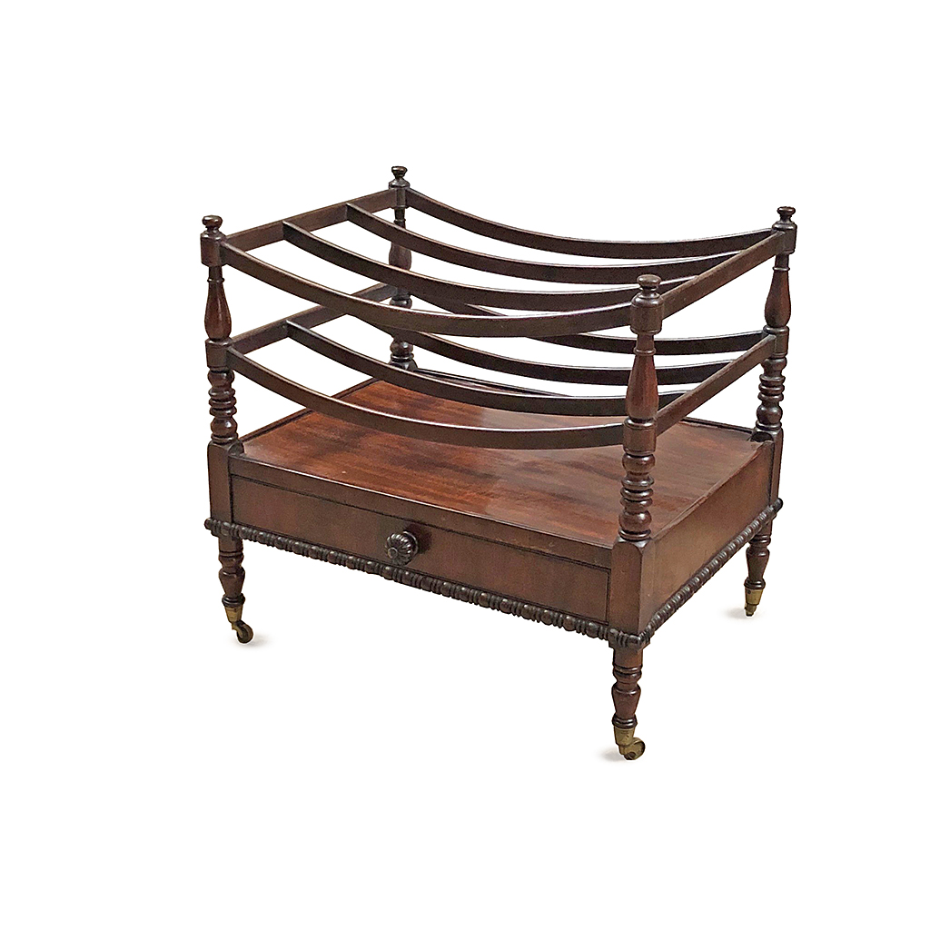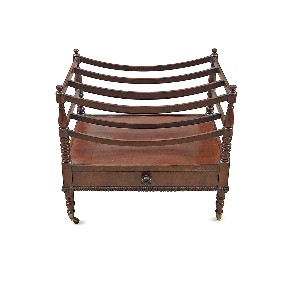 REGENCY MAHOGANY CANTERBURY / MAGAZINE RACK WITH SINGLE DRAWER TURNED LEGS WITH BRASS CASTORS 49 CM HIGH 53 CM WIDE 39 CM DEEP