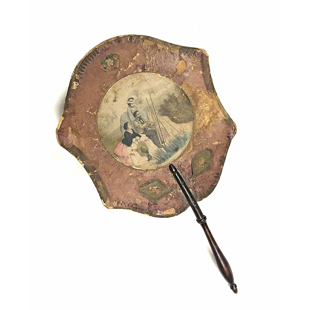 VICTORIAN PAPER / PAPIER MACHE FIRE FAN WITH WOODEN HANDLE AND IMAGE OF PAINTING SCENE