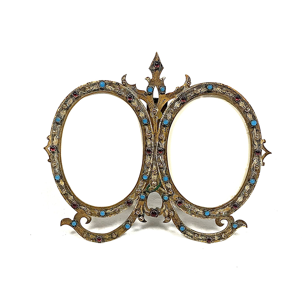 BRASS DOUBLE OVAL PHOTO FRAME WITH TURQUOISE AND GLASS BEAD DECORATION 10 CM HIGH 14 CM WIDE