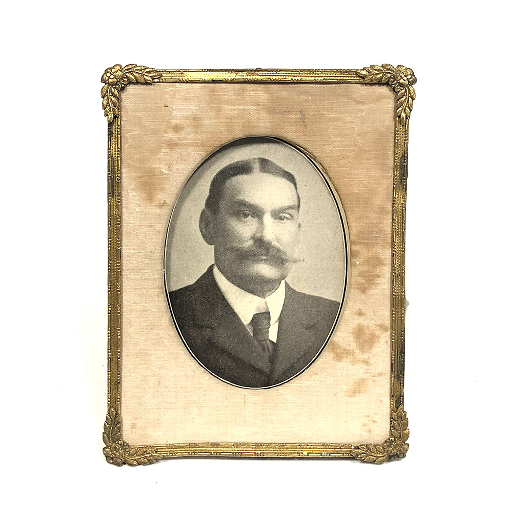 MEDIUM BRASS PHOTO FRAME WITH LINEN OVAL MOUNT AND CORNER FLORAL DECORATION 14 CM HIGH 10 CM WIDE