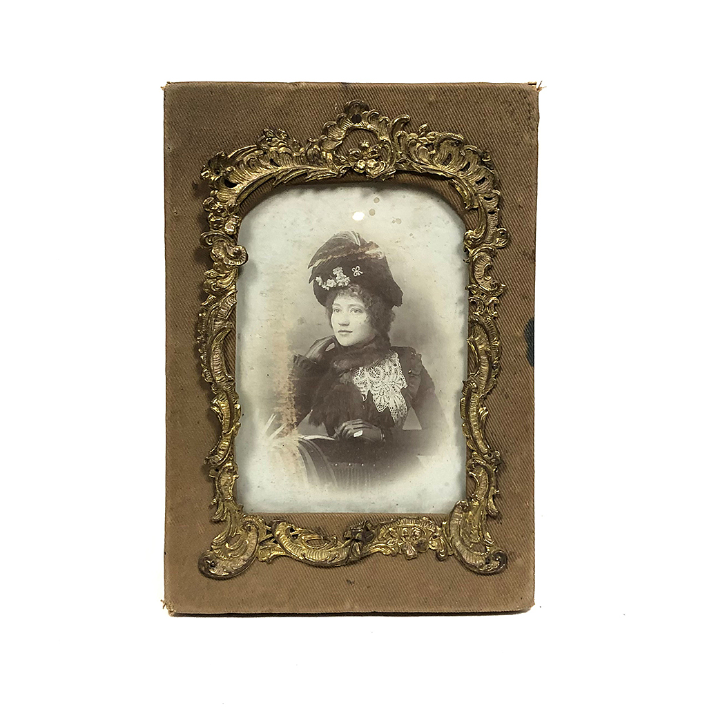 PHOTO FRAME WITH LINEN BACKGROUND AND DECORTIVE GILT RELIEF INNER BORDER 21.5 CM HIGH 15 CM WIDE