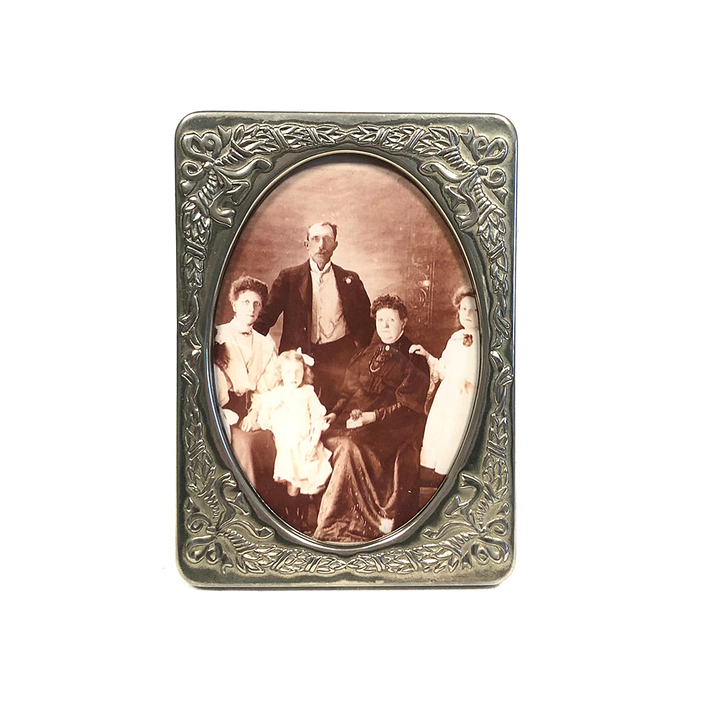 SILVER METAL PHOTO FRAME WITH ORNATE GARLAND AND BOW RELIEF AND OVAL MOUNT 14.5 CM X 10.5 CM