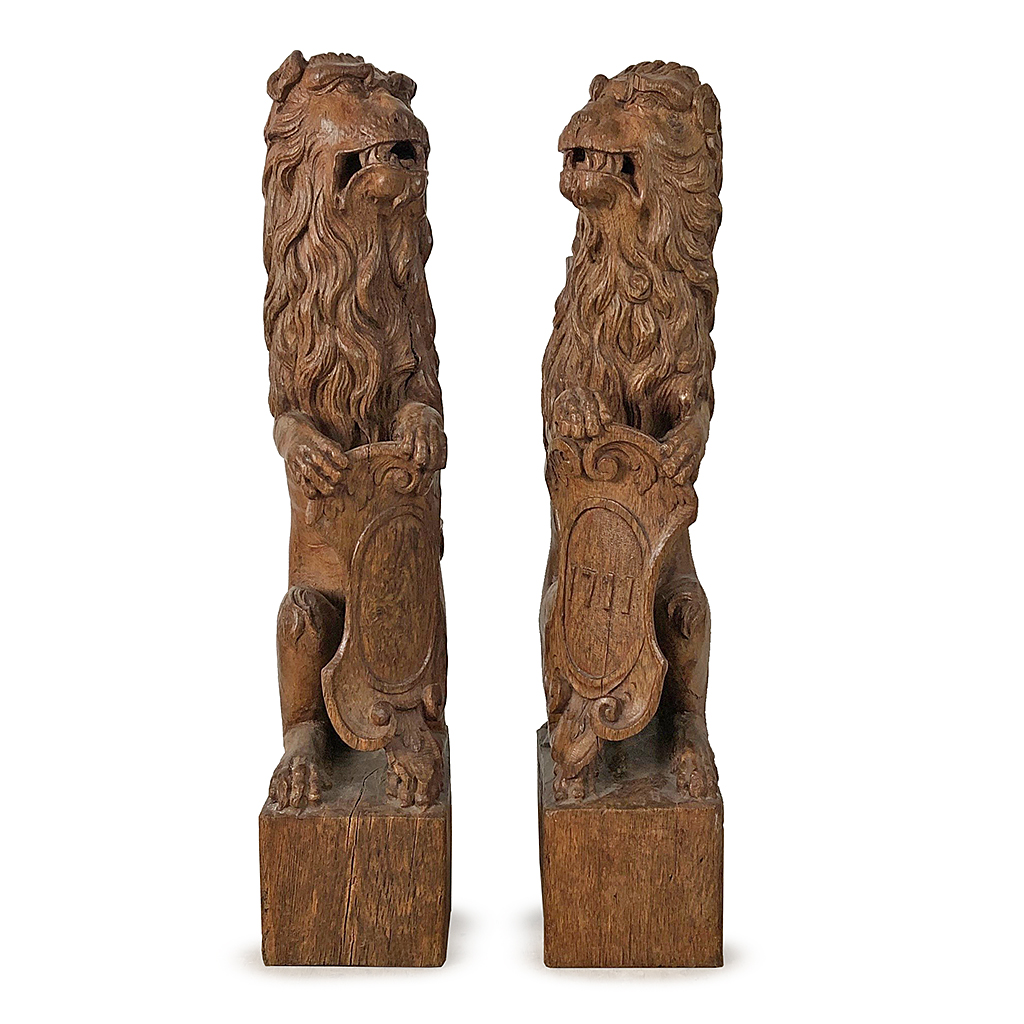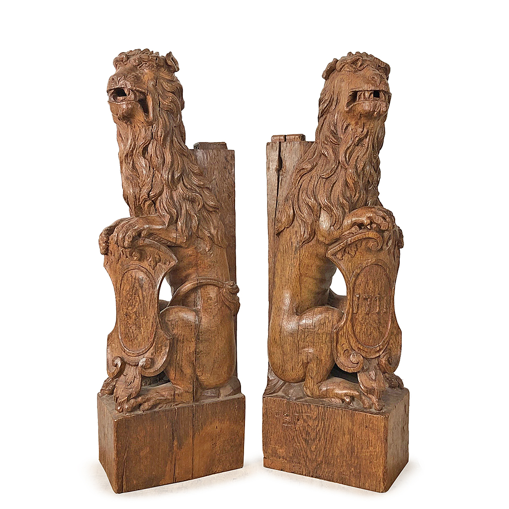 FINE FLEMISH CARVED OAK HERALDIC LION DATED 1711 FORMER NEWEL POST 89 CM HIGH 19 CM WIDE 29 CM DEEP (X2)