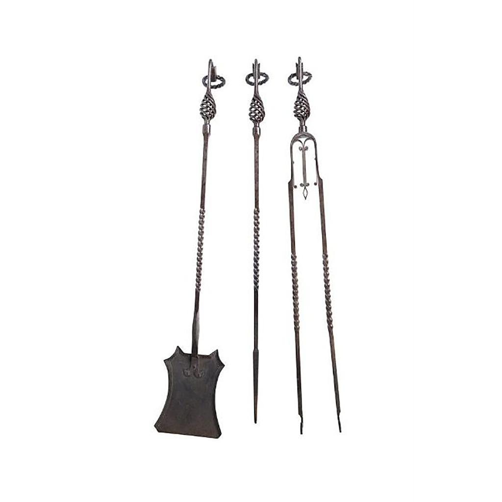 SET OF THREE FIRE TOOLS POKER SHOVEL AND TONGS WROUGHT IRON WITH DRAGON HEAD AND BASKET WEAVE HANDLES 94 CM LONG