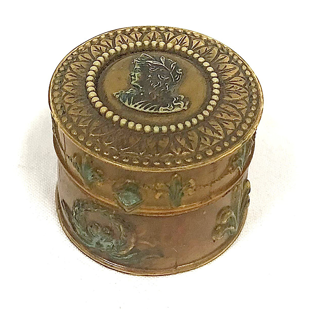 FAUX TORTOISESHELL CIRCULAR SNUFF / PILL BOX WITH ORNATE FLORAL RELIEF AND CENTRAL EMPEROR DESIGN DECORATION 4 CM DIAMETER