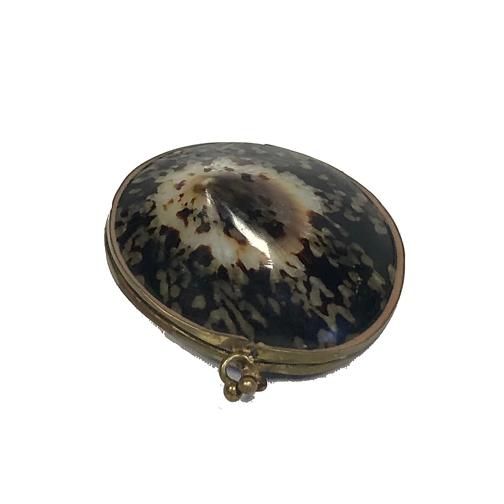 POLISHED OPIHI SHELL SNUFF / PILL BOX WITH BRASS RIM AND CLASP 5.5 CM LONG