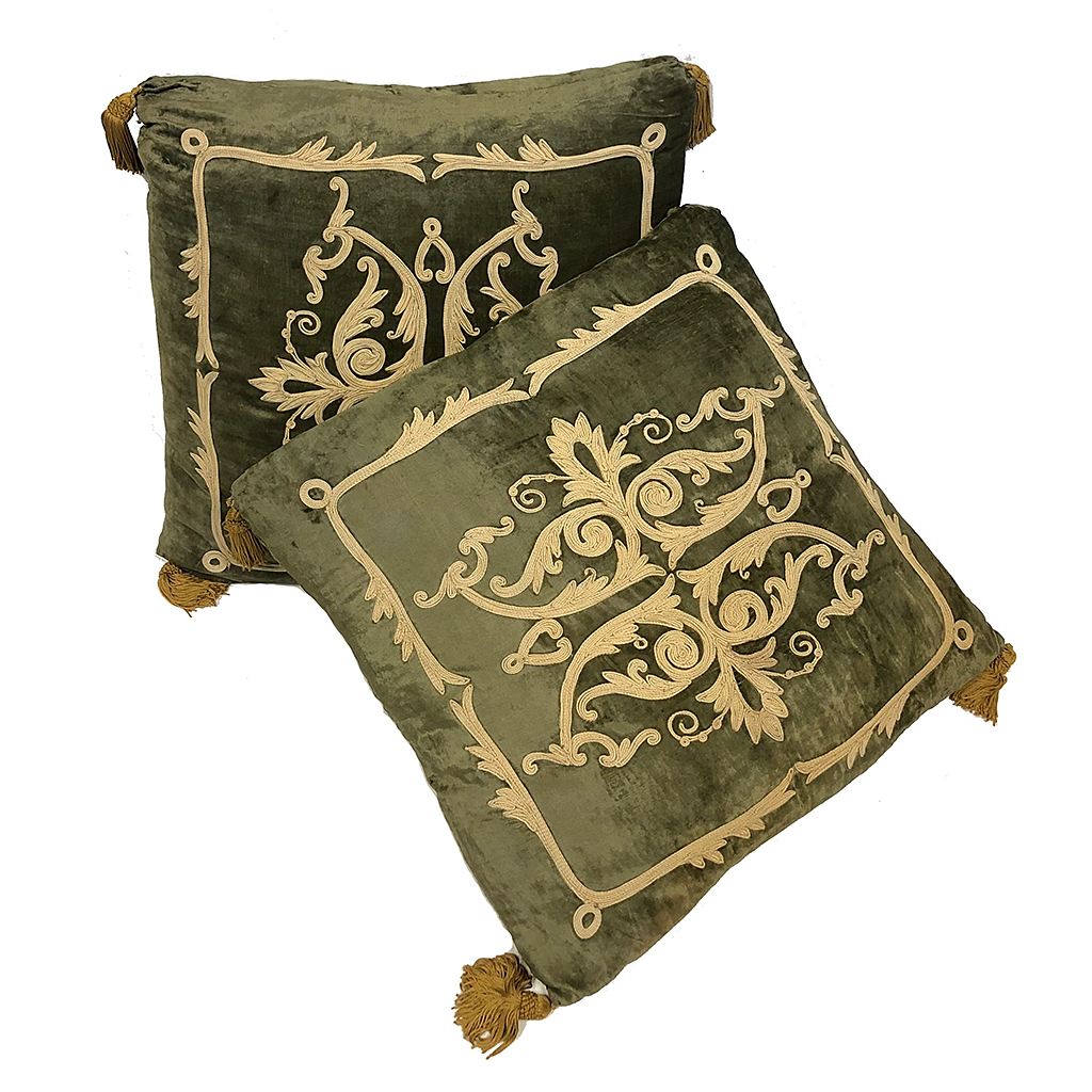 KHAKI SQUARE CRUCHED VELVET CUSHION WITH BEIGE BRAID DECORATION AND TASSEL CORNERS 47 CM X 47 CM