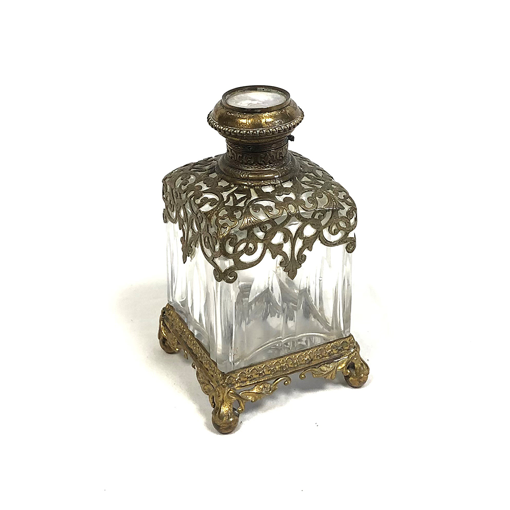 EARLY GLASS SCENT BOTTLE WITH GILT BASE WITH BALL FEET ORNATE GILT FILIGREE COVER AND GILT COLLAR WITH PORTRAIT ON LID 12 CM HIGH / 7 CM WIDE