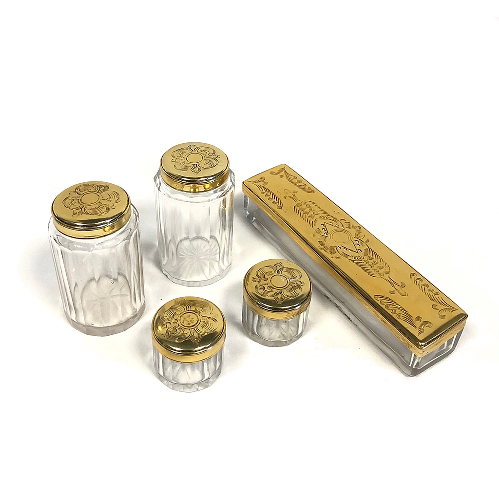 SET OF FIVE GLASS AND GILT ENGRAVED TOP SCENT BOTTLES / POTS COMPRISING OF 2 X MEDIUM BOTTLES 2 X SMALL POTS AND 1 X LONG RECTANGULAR POT
