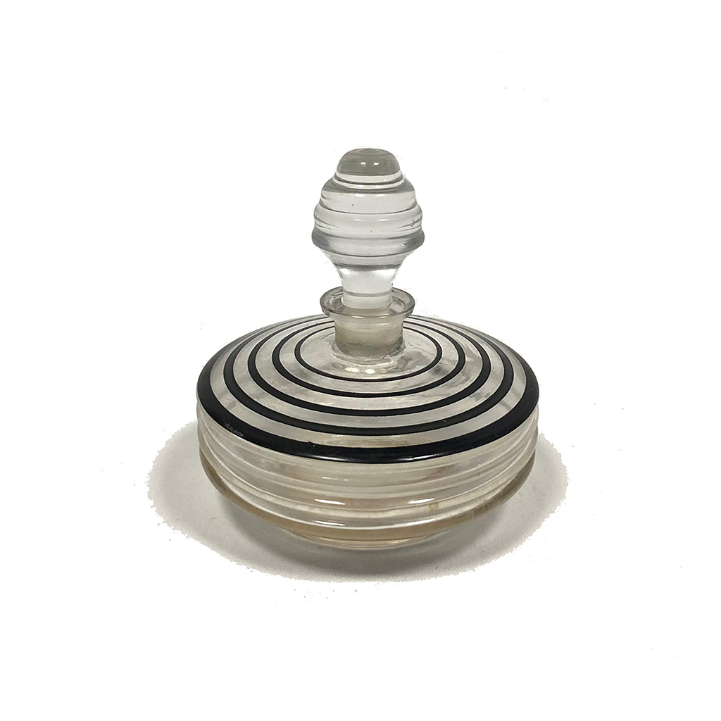 FLAT FLASK SHAPE SCENT BOTTLE WITH GLASS STOPPER AND BLACK STRIPE CIRCLE DECORATION 9.5 CM HIGH / 8.5 CM DIAM.