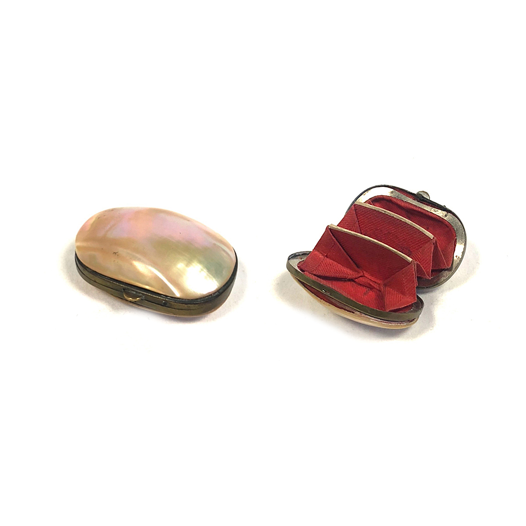 SMALL MOTHER OF PEARL COIN PURSE WITH BRASS FRAME AND RED INTERIOR 7 CM LONG / 5 CM WIDE
