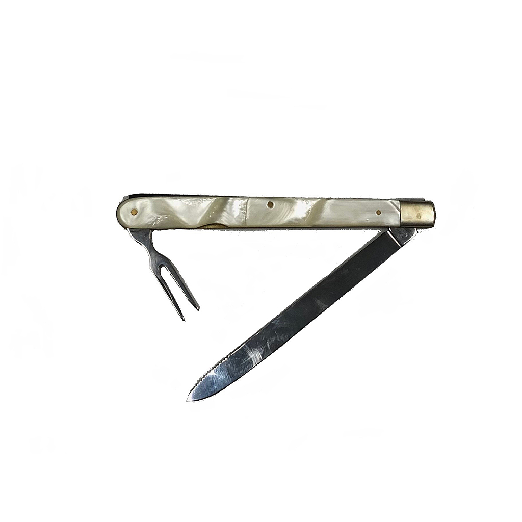 MOTHER OF PEARL ROSTEFREI TRAVEL KNIFE AND FORK / PRONG 14 CM LONG