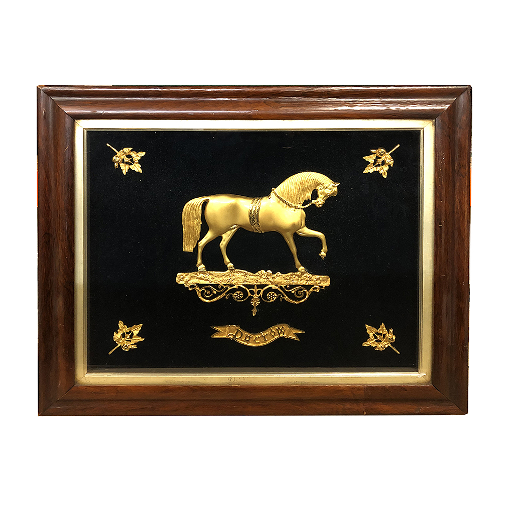 19TH CENT GILT BRONZE HORSE PLAQUE WITH LEAF CORNER MOUNTS IN A ROSEWOOD FRAME 62 CM HIGH 72 CM WIDE OVERALL