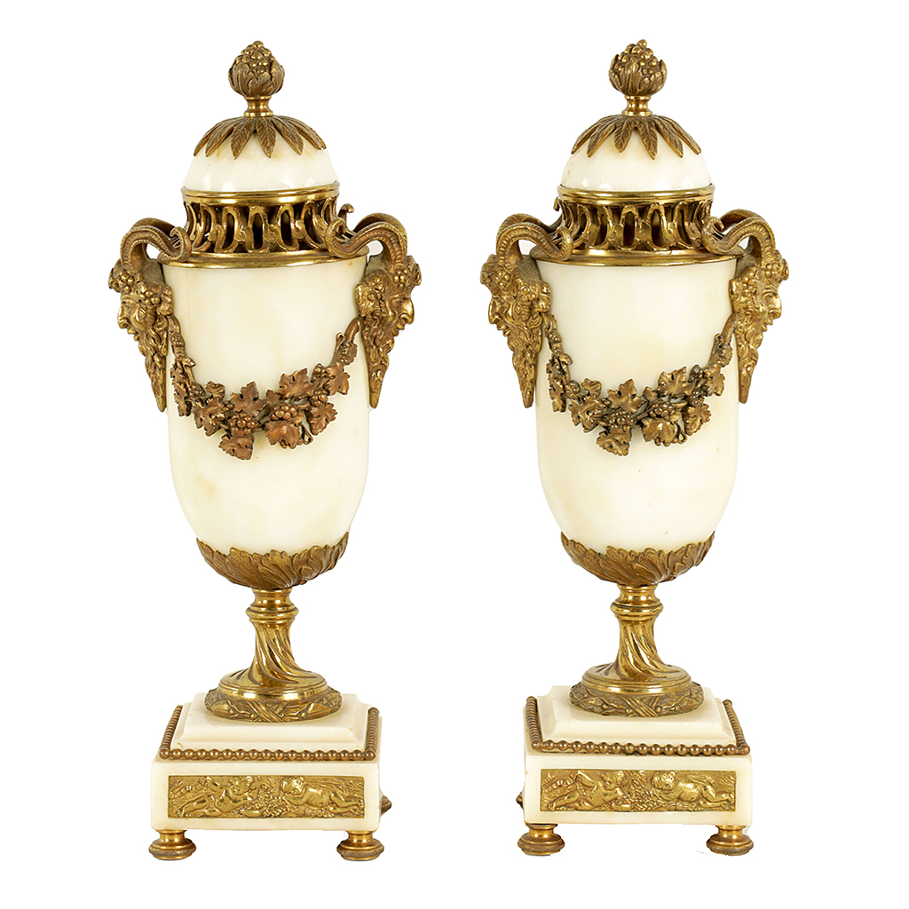 FRENCH WHITE CARRARA MARBLE URN WITH ORMOLU GRIFFIN AND CHERUB MOUNTS 19TH CENT 36 CM HIGH (X2)