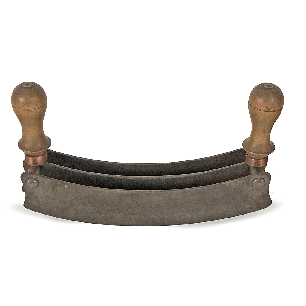 TWO DIVISION TWIN HANDLED HERB CUTTER STEEL WITH TURNED WOOD HANDLES 29 CM LONG