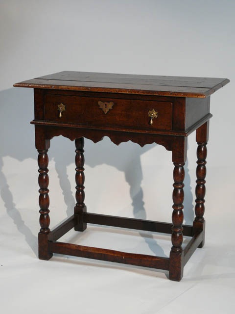QUEEN ANNE SMALL OAK SIDE TABLE WITH SINGLE DRAWER WITH BRASS PEAR DROP HANDLES AND TURNED LEGS 76 CM LONG 46 CM DEEP 73 CM HIGH