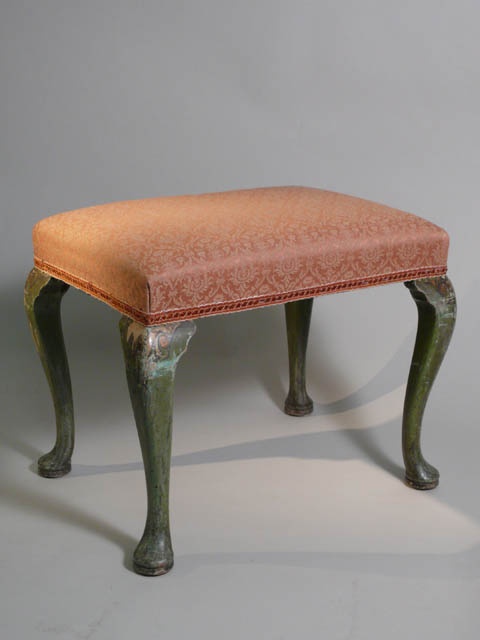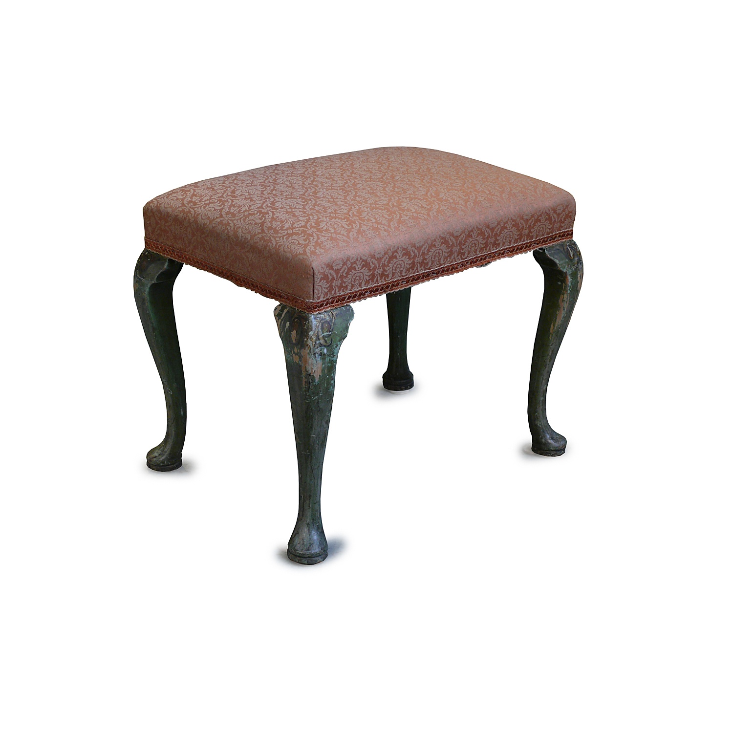 QUEEN ANNE STYLE PALE GREEN DECORATED STOOL PINK BROCADE UPHOLSTERY 49 CM HIGH 60 CM WIDE 44 CM DEEP