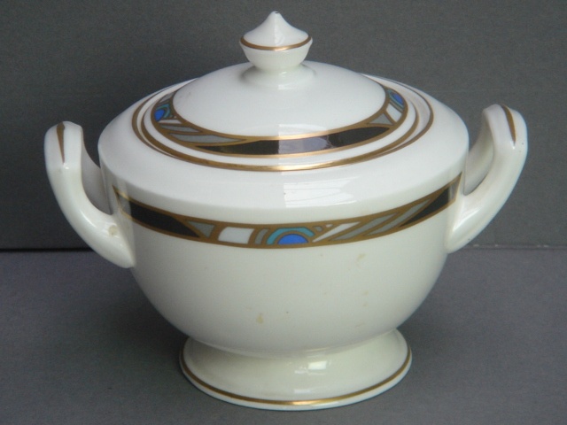 RAFFLES ROYAL WORCESTER SUGAR BOX WITH LID TWIN HANDLE ART DECO BORDER (X2)