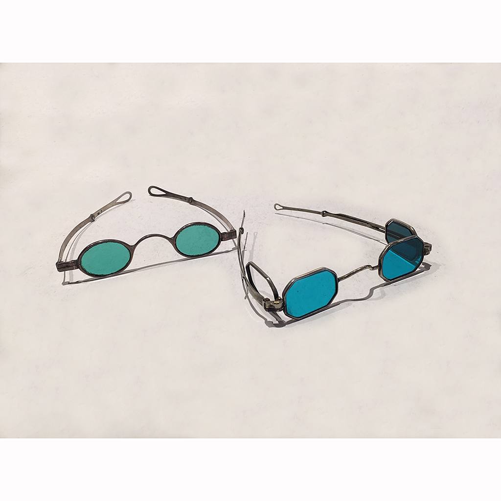 RARE EARLY 19TH CENTURY SILVER SUNGLASSES WITH GREEN LENSES AND EXTENDING ARMS