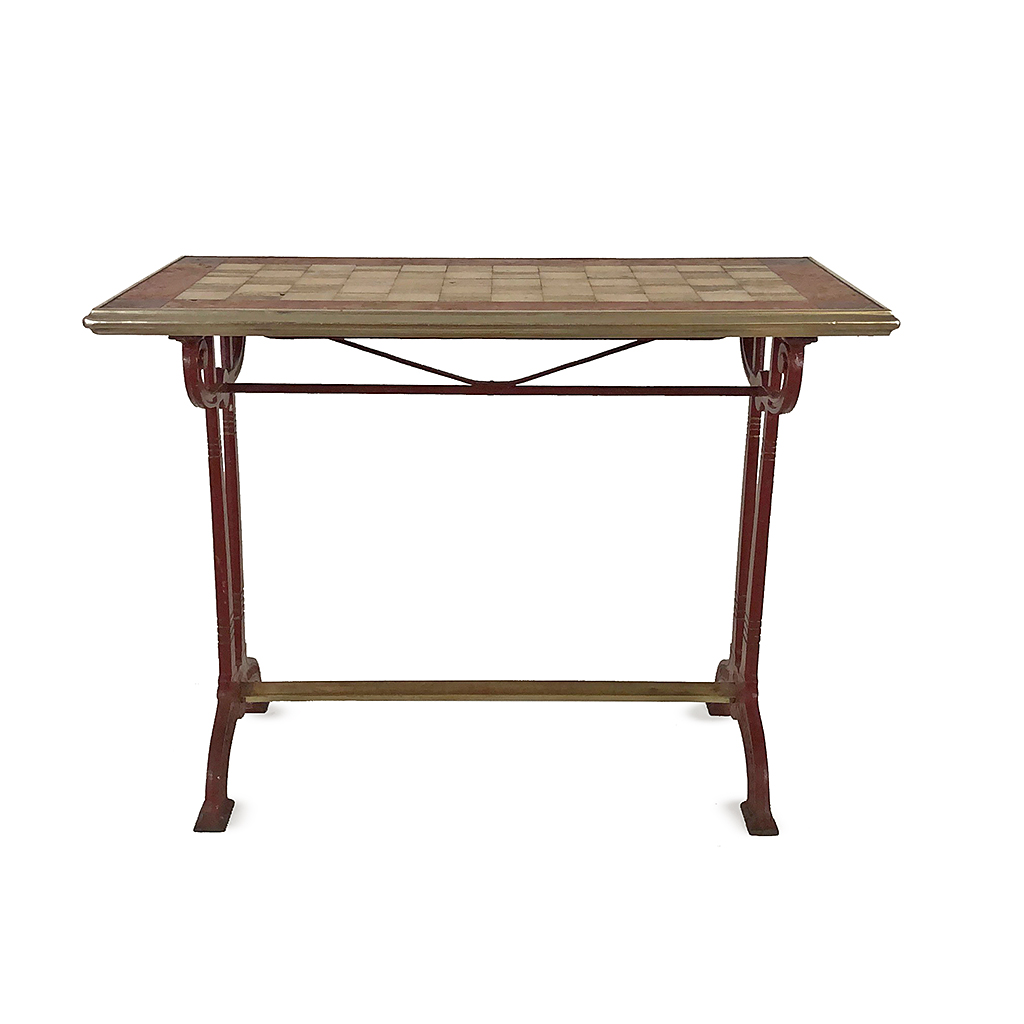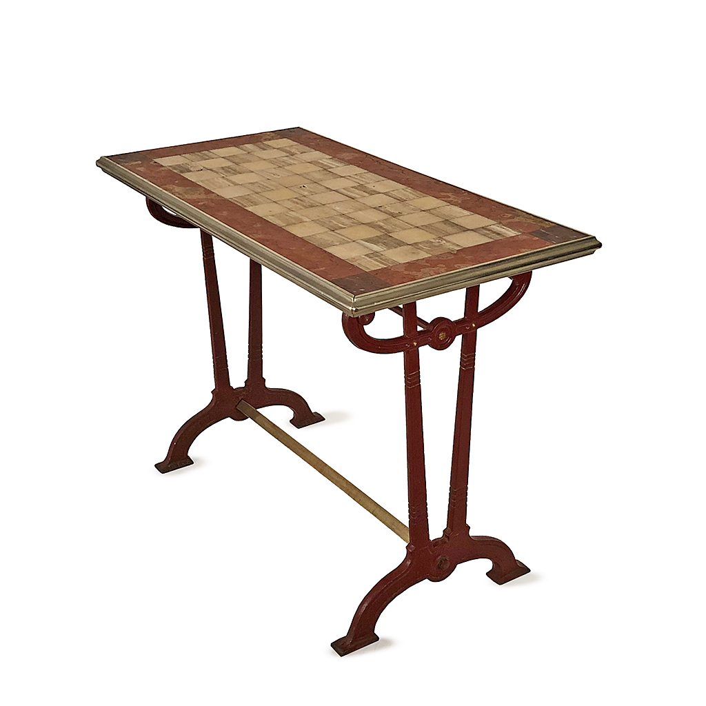 RARE FRENCH CAFE TABLE BROWN PAINTED CAST IRON BASE WITH A CHEQUERED BROWN AND CREAM MARBLE TOP CIRCA 1918 75 CM HIGH 103 CM LONG 52 CM WIDE