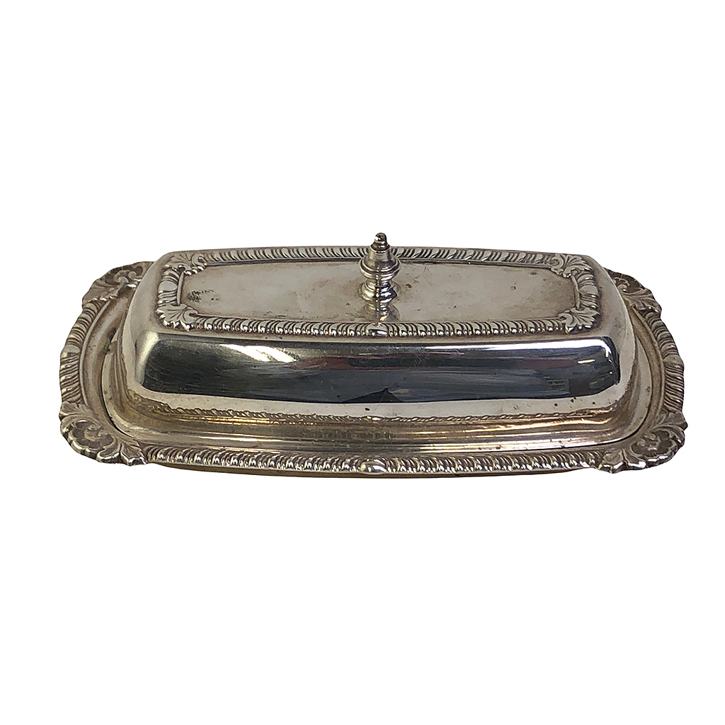 RECTANGULAR SILVER BUTTER DISH WITH LID AND GLASS LINER FLORAL CORNERS (X4)