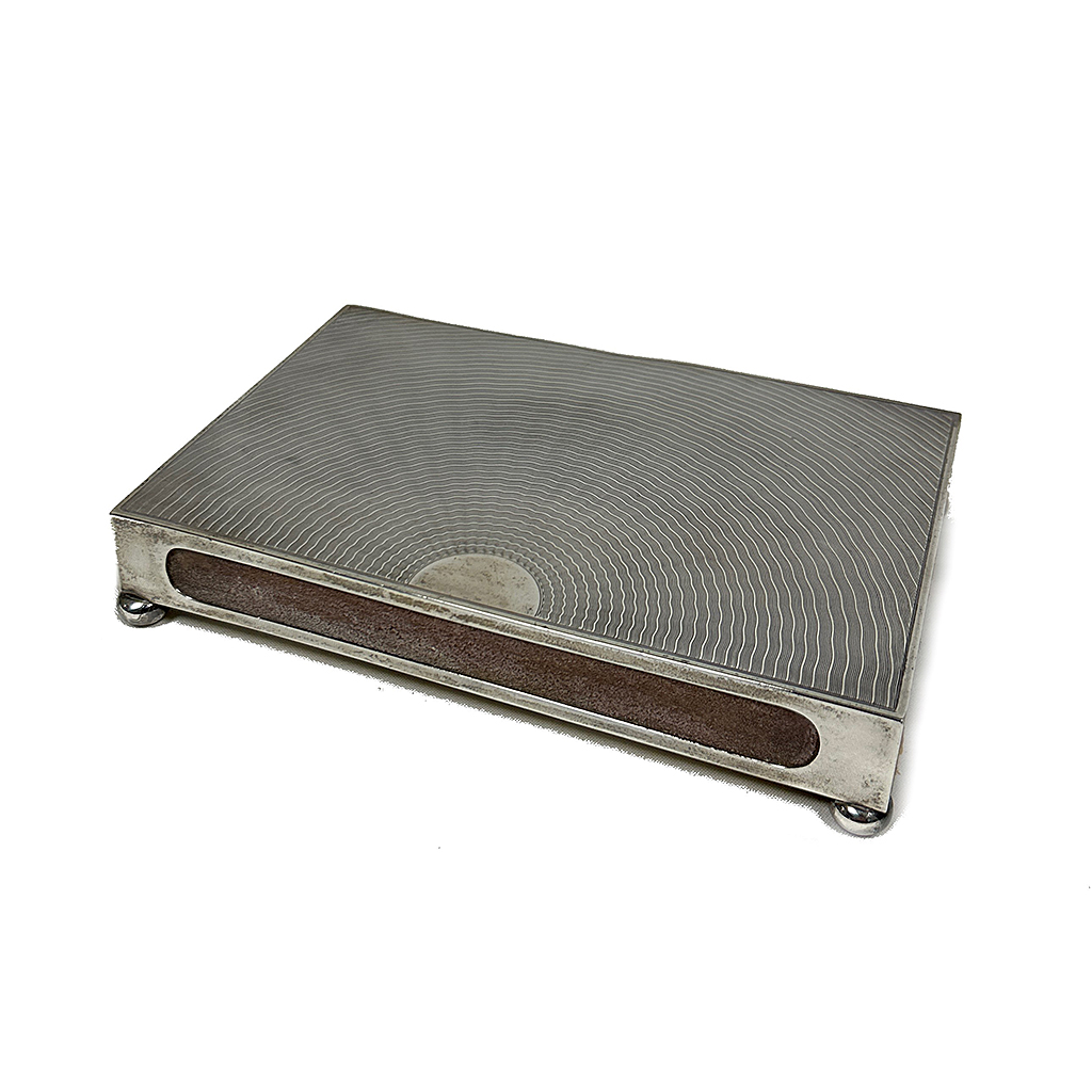 RECTANGULAR SILVER MATCH HOLDER BOX WITH FAN SHAP ENGINE WORK DECORATION 16 CM LONG / 10.5 CM DEEP